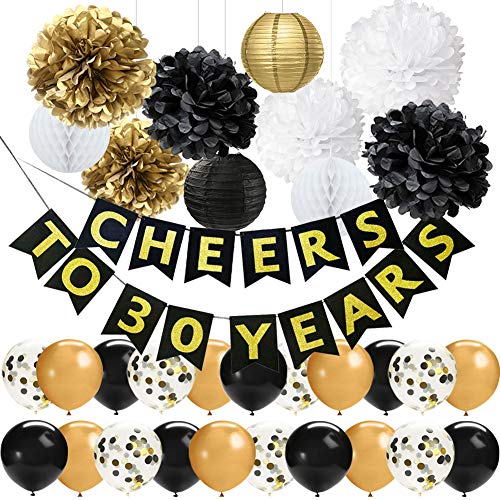 30th Wedding Anniversary Decorations Set 30th Birthday Party Decorations Kit Black Gold Cheers To 30 Years Banner Tissue Pom Poms Flowers Paper Lanterns Paper Fans Paper Triangle Garland Banners Garlands