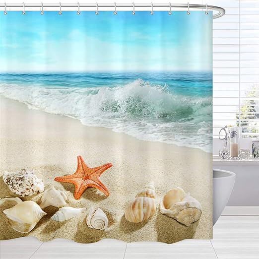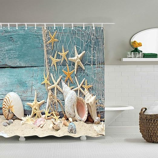 Amazon Com Beach Shower Curtain Fabric Seashells Starfish Conch Stones On Beach Blue Ocean Bath Bathtub Curtain Home Decor Fabric Bathroom Accessories Set With Hooks Kitchen Dining