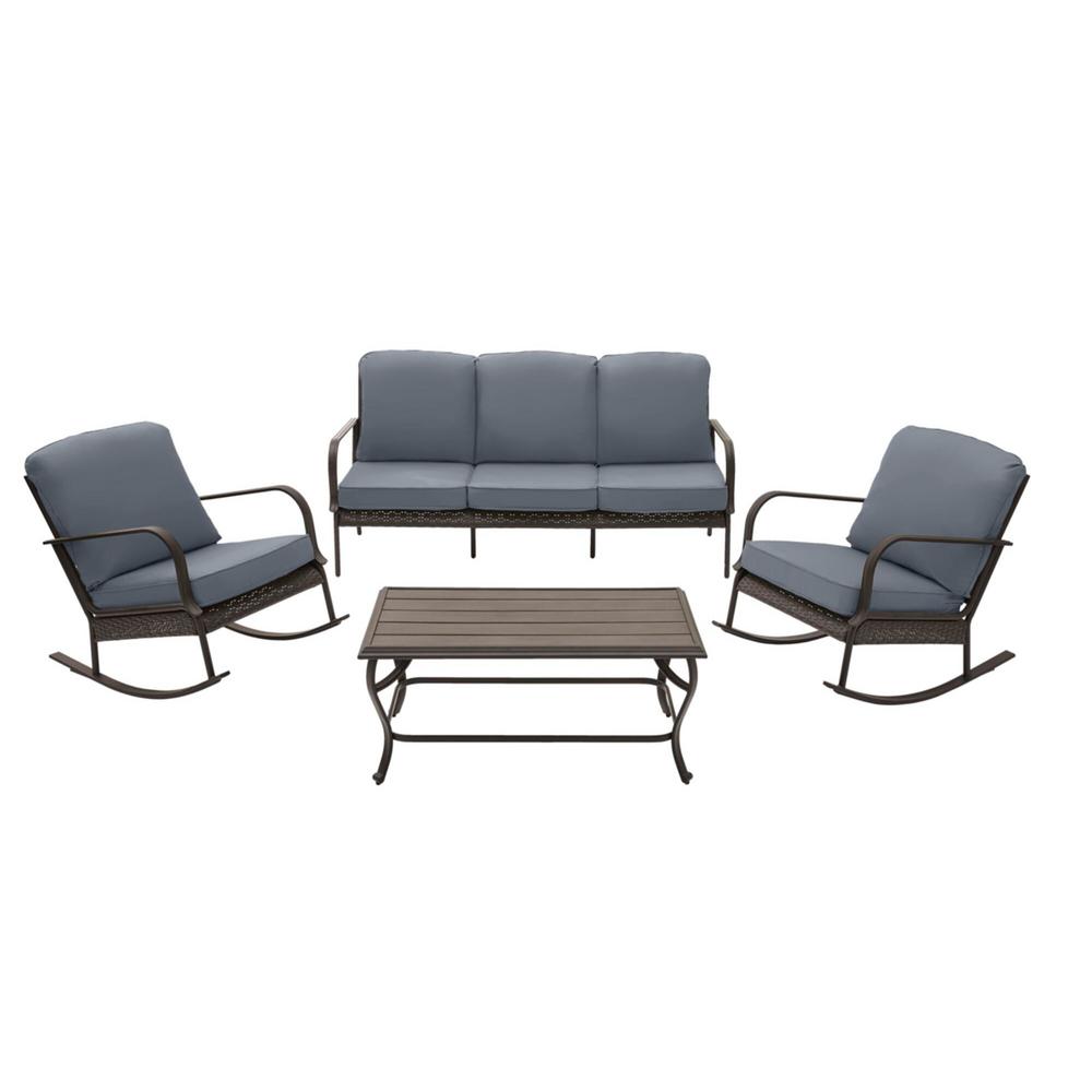 Hampton Bay Becker 4 Piece Dark Mocha Steel Outdoor Patio Chat Seating Set With Cushionguard Steel Blue Cushions H170 01439700 The Home Depot