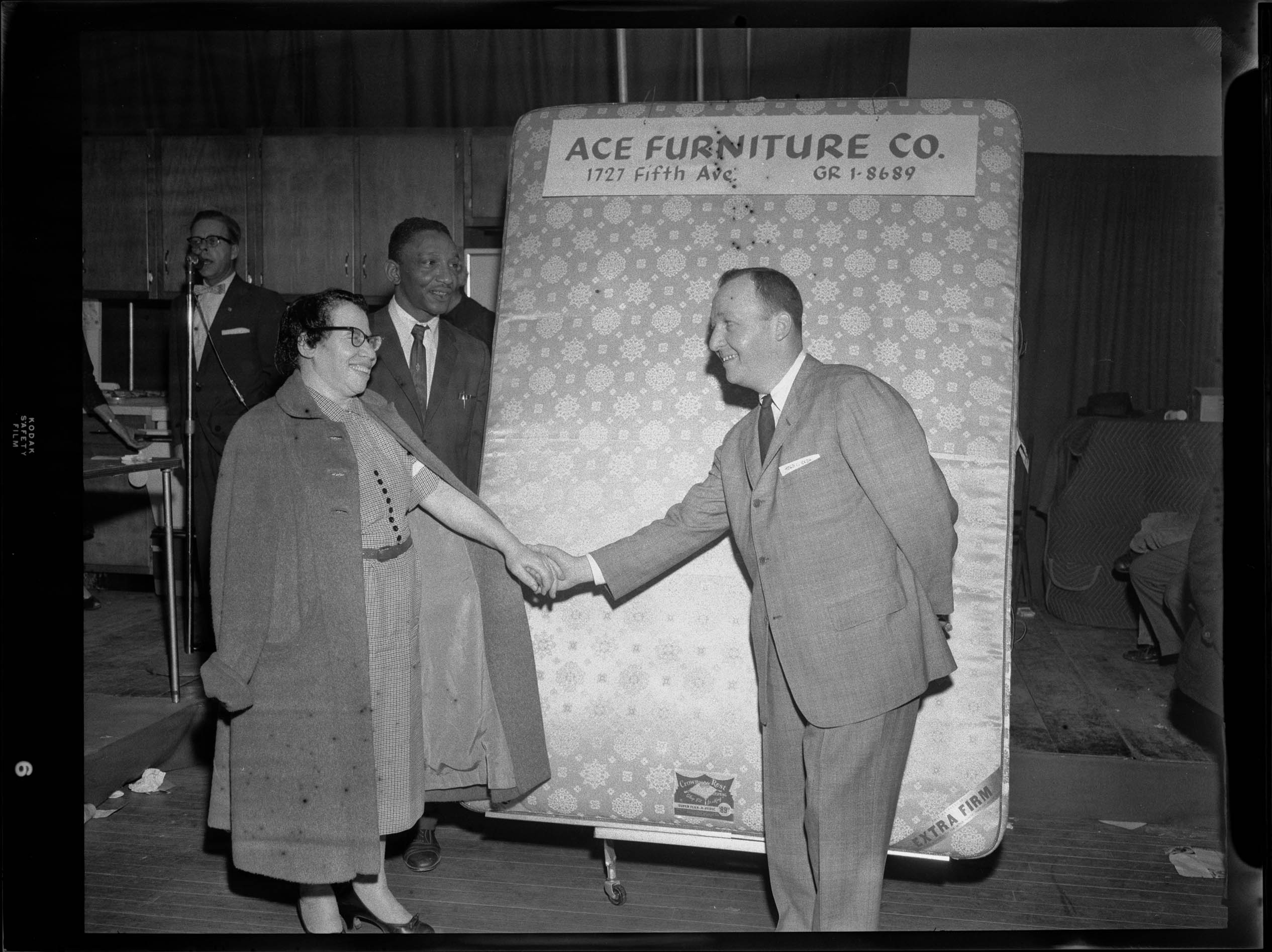 Lucinda Mallory Being Congratulated For Winning Mattress Larry Berlin Of Ace Furniture Company In Syria Mosque For The 1958 Pittsburgh Courier Home Service Fair Cmoa Collection