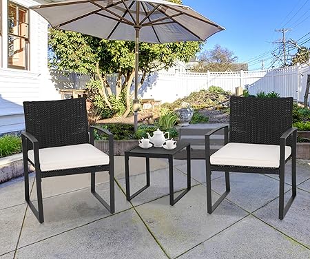 Amazon Com Suncrown Outdoor Furniture 3 Piece Patio Bistro Set Black Wicker Chairs And Glass Top Coffee Table Beige White Cushion Garden Outdoor