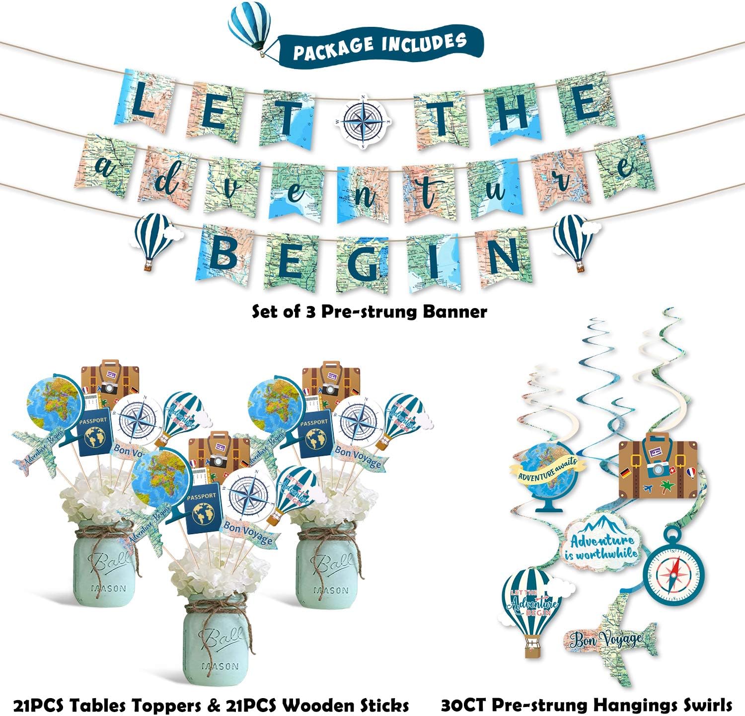 Banners Toys Games Travel Themed Party Decorations Set Let The Adventure Begin Banner Centerpieces Sticks And Hanging Swirls For Bon Voyage Retirement Farewell Party World Awaits Birthday Baby Shower Decorations Supplies