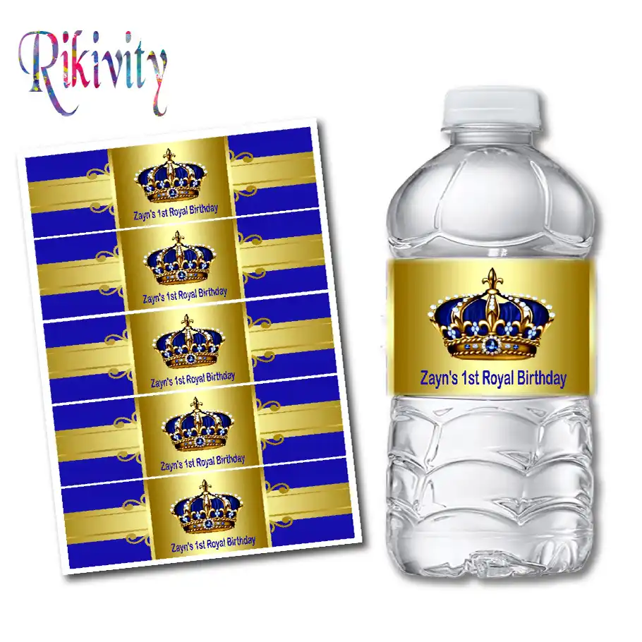 Blue Gold Prince Water Bottle Wrappers Labels For A Prince Baby Shower Crown Royal Adly Invitations And Digital Party Designs