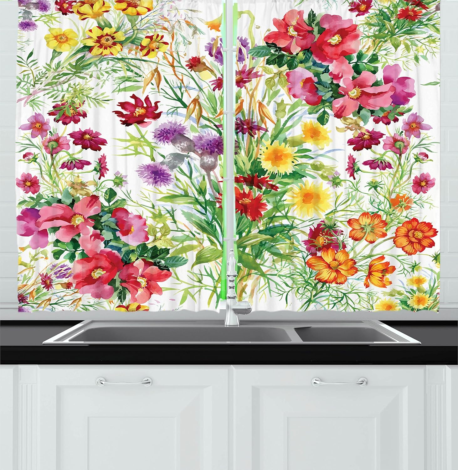 Amazon Com Ambesonne Flower Kitchen Curtains Floral Design Garden Like Romantic Theme Image With Leaves Rose Blooms Daisies Image Window Drapes 2 Panel Set For Kitchen Cafe Decor 55 X 39 Yellow Pink