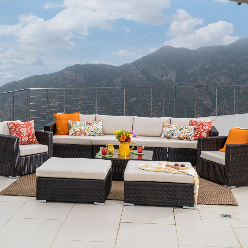Noble House Santa Rosa Multi Brown 9 Piece Wicker Outdoor Sectional Set With Beige Cushions 11270 2 The Home Depot