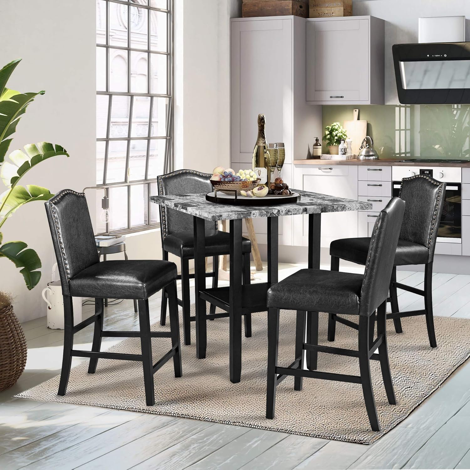 Amazon Com Harper Bright Designs 5 Piece Dining Table Set With Faux Marble Veneer Tabletop Bottom Shelf 4 Upholstered Chairs For Kitchen Dining Room Furniture Set Black Chair Gray Table Table Chair