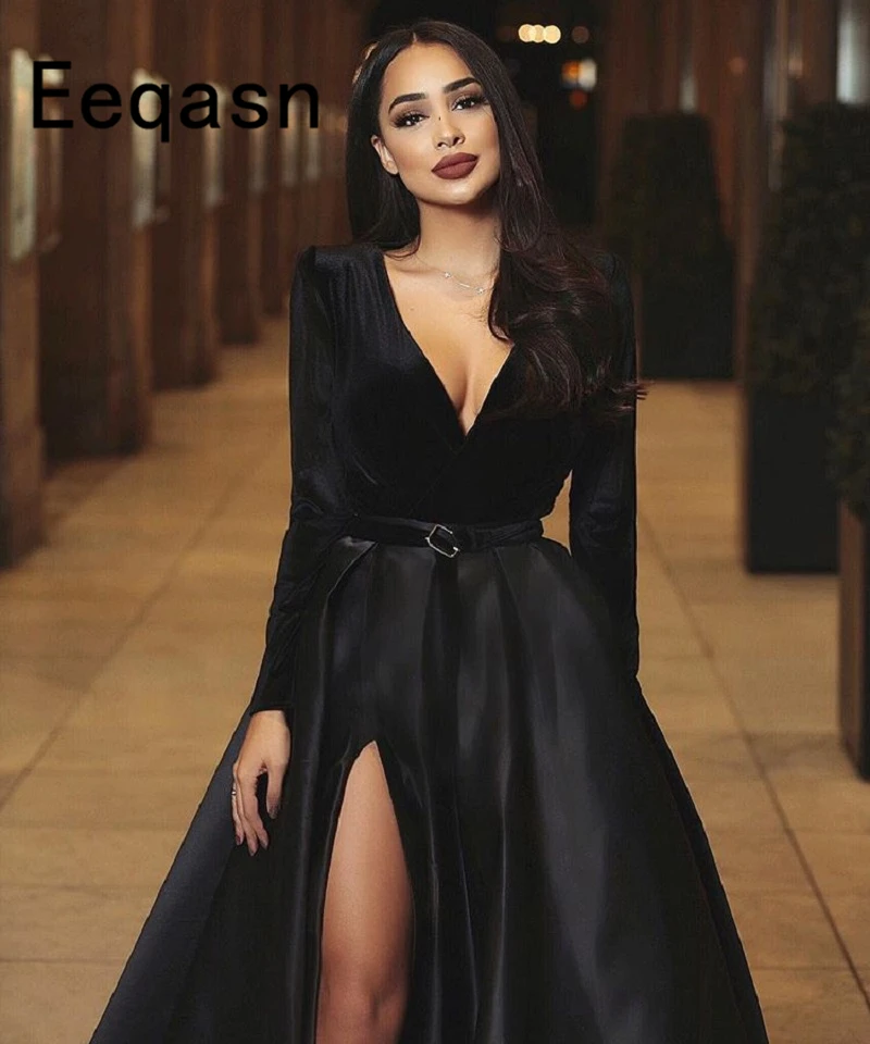 New Long Sleeves Floor Length Black Evening Dresses Long 2020 Elegant V Neck Slit Red Carpet Celebrity Prom Party Gowns Evening Dresses Aliexpress