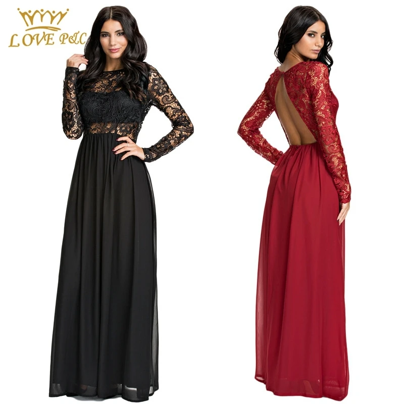 Buy Women Sexy Backless Long Sleeve Black Red Lace Dress Floor Length Chiffon A Line Elegant Long Dress Bodycon Maxi Dress S 5xl In Cheap Price On Alibaba Com