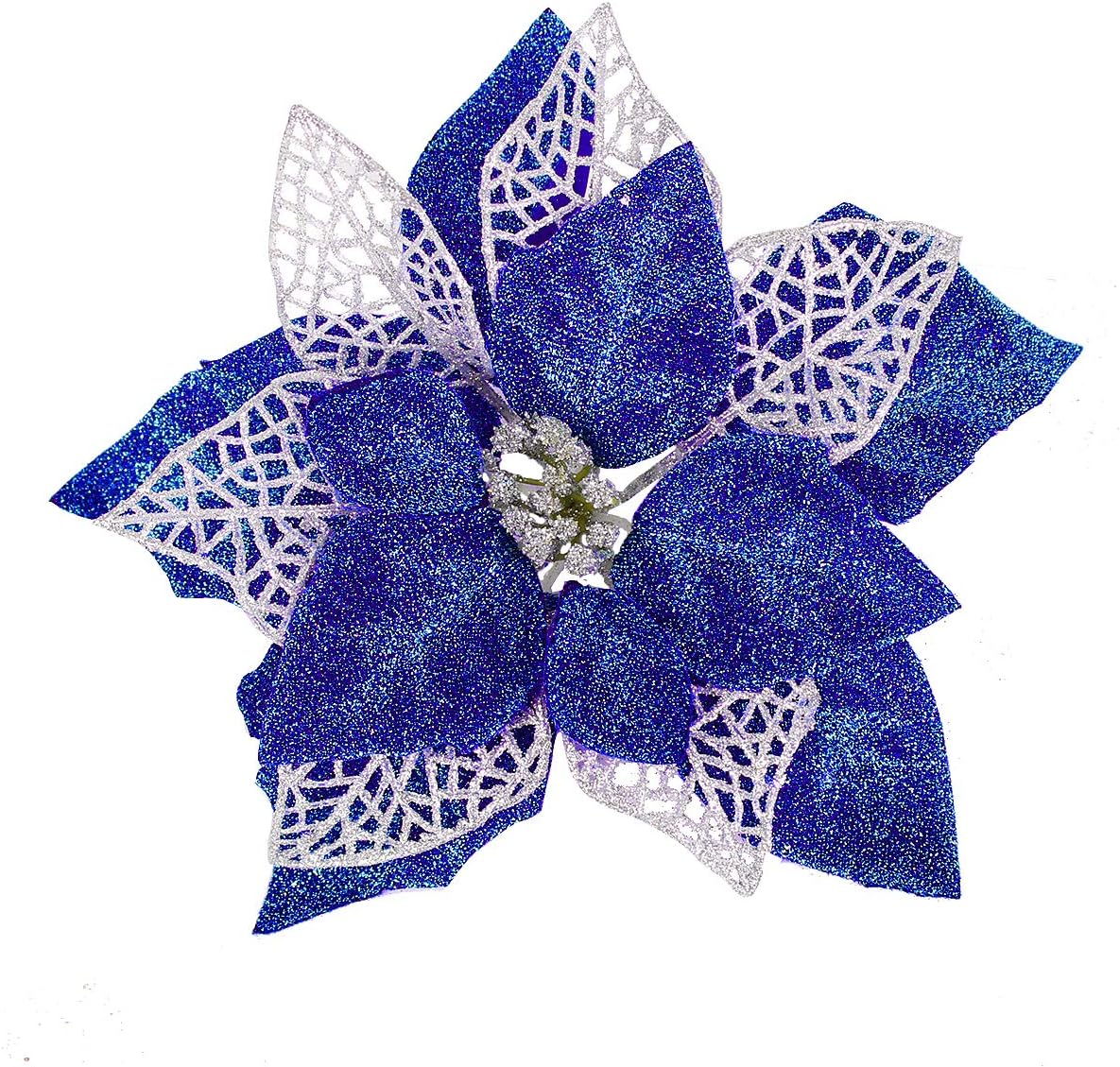 Amazon Com Blooming Paradise Pack Of 12 Glitter Poinsettia Christmas Tree Ornaments Christmas Decorations Flower Navy Blue Kitchen Dining