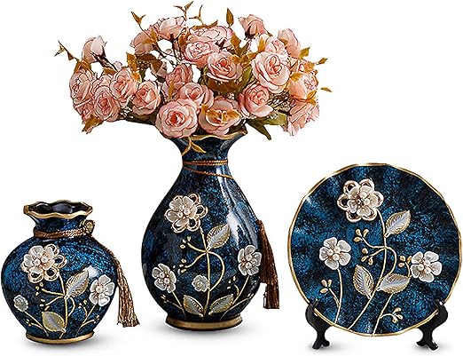 Amazon Com Inglenix Set Of 3 Indigo 3d Emboss Flower Vases Special Design Style Of Oriental Classicism Blue And White Ceramic Decorative Vases For Kitchen Office Wedding Or Living Room Kitchen Dining