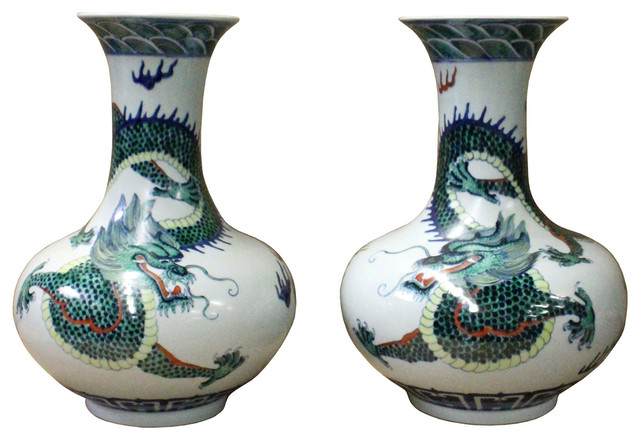 Chinese Oriental Ceramic Porcelain White Green Dragon Vases 2 Piece Set Asian Vases By Golden Lotus Antiques
