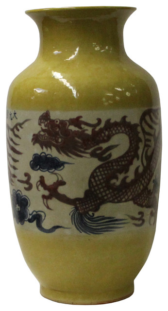 Handmade Ceramic Chinese Dragon Motif Yellow Glaze Vase Hcs4653 Asian Vases By Golden Lotus Antiques
