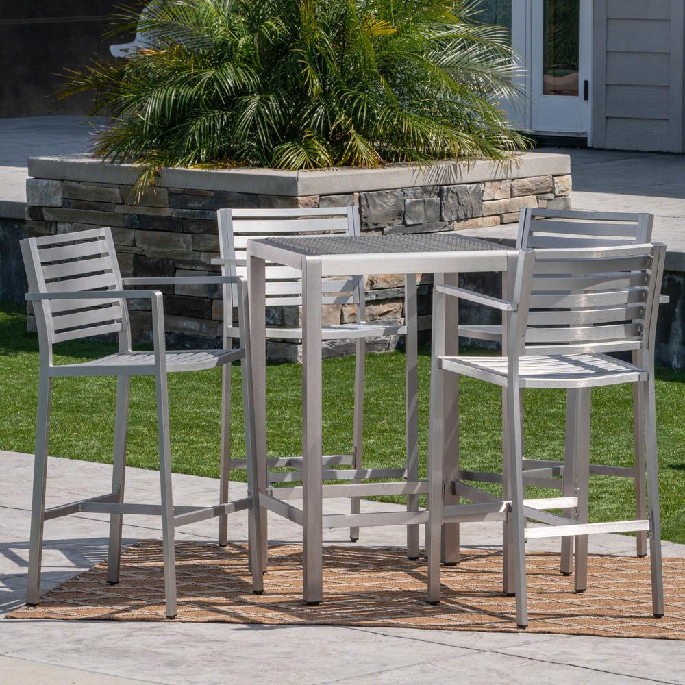 Noble House Cape Coral Silver 5 Piece Aluminum Outdoor Bar Height Bistro Set With Gray Wicker Top Table 41670 The Home Depot