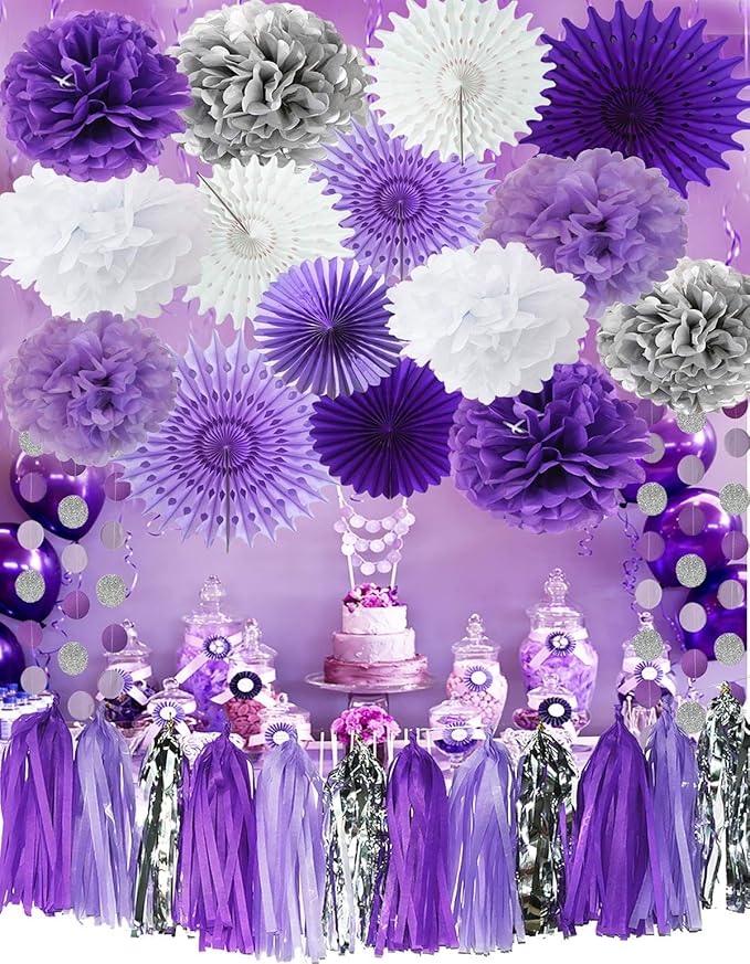 Amazon Com Purple Silver Birthday Decorations For Women Bridal Shower Decorations Purple White Silver Tissue Pom Pom Purple Silver Circle Paper Garland For Baby Shower Decorations Purple Birthday Decorations Toys Games