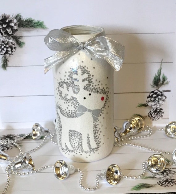 Large Reindeer Christmas Decoupage Jar Silver Decoupage Etsy