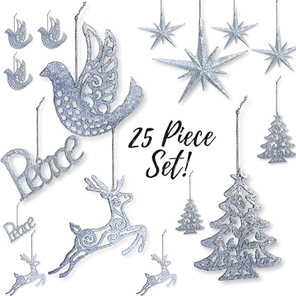 Amazon Com Banberry Designs Silver Christmas Decorations Pack Of 25 Shatterproof Xmas Ornaments Peace Dove Christmas Tree Reindeer And Moravian Stars Glittered Holiday Tree Ornaments Kitchen Dining