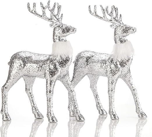 Amazon Com Sanno 2 Deers 12 Silver Glitter Christmas Reindeer Ornament Figurines Decor Holiday Reindeer Figurines Standing Silver Glitter Indoor Decorative Ornaments For Tabletop Shelf Desk Office Home Kitchen