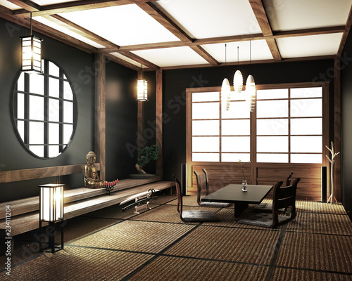Interior Design Modern Living Room With Table Katana Sword Lamp And Bonsai Tree On Room Tatami Mat Floor The Design Is Hard To Find 3d Rendering Buy This Stock Illustration And Explore Similar