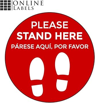 Amazon Com Social Distancing Floor Signs In English Spanish Pack Of 5 Stickers Red Stand Here Design 12 Inch Circle Indoor Only Removable Adhesive Vinyl Online Labels Office Products