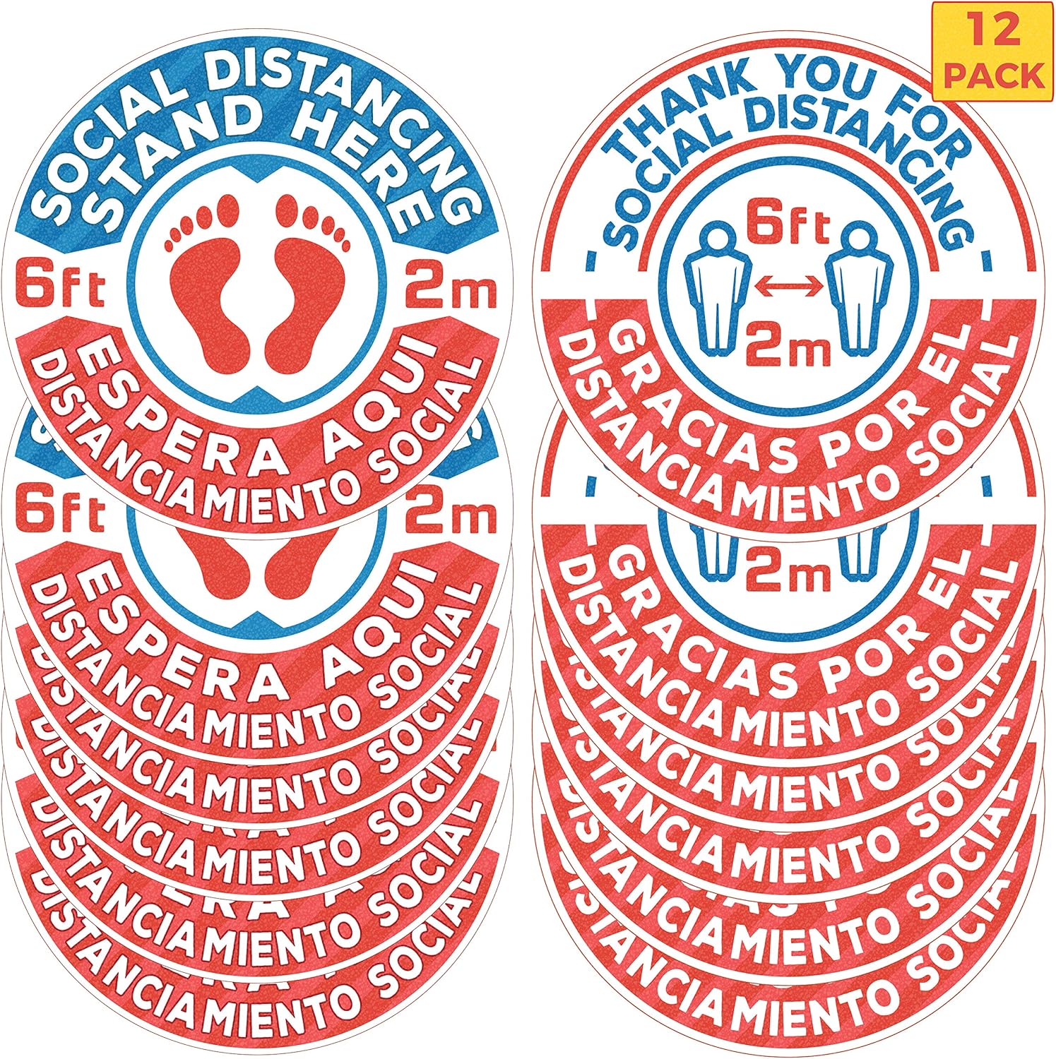 Amazon Com 12 Pack 8 Inch Bilingual Social Distancing Floor Sticker Decals Professional English Spanish Anti Slip Waterproof 6 Feet Social Distancing Floor Signs Removable For Hard Floors Or Carpet Office Products