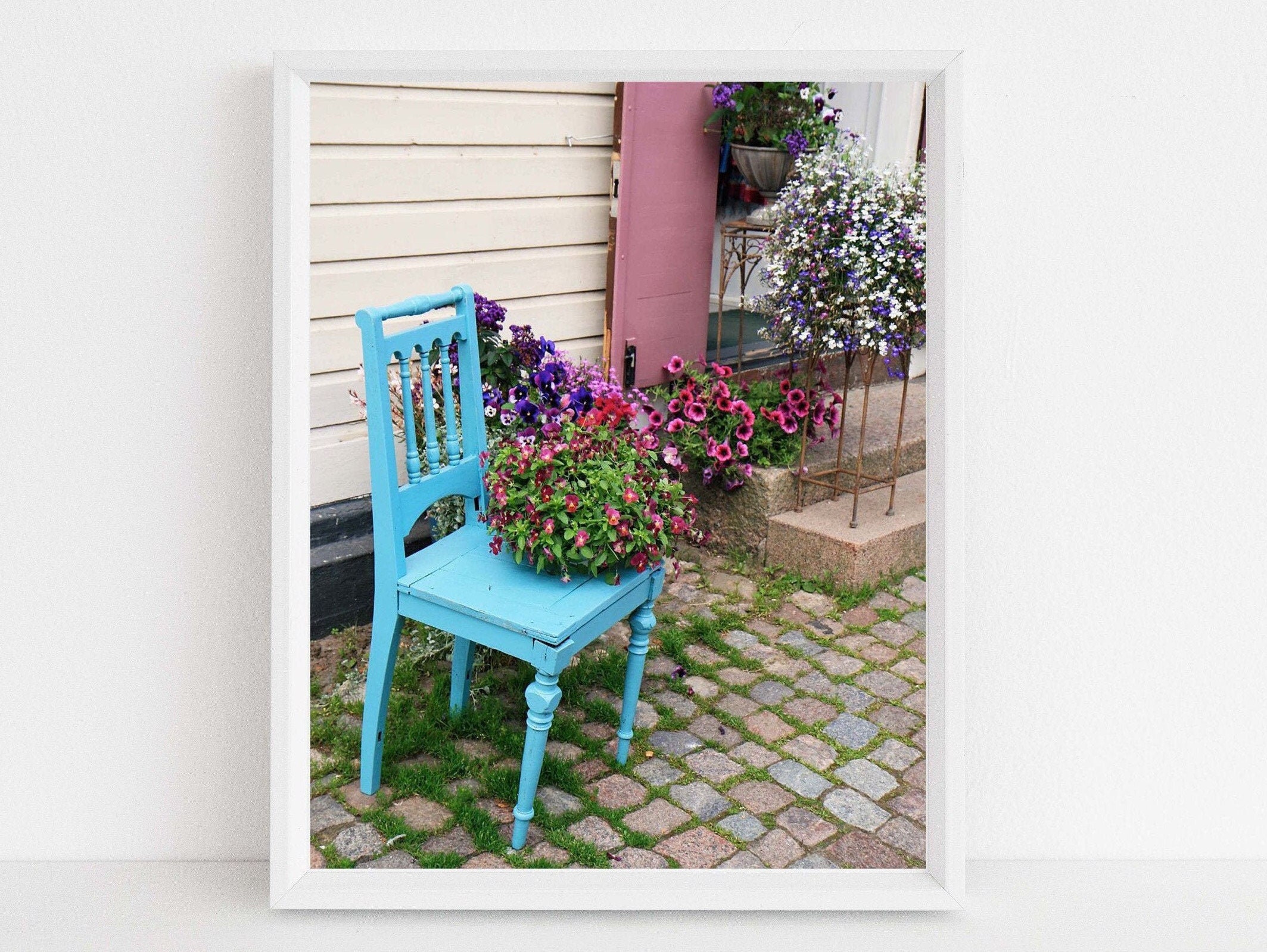 Blue Chair Photography Print Country Wall Decor Porvoo Finland Photograph Aqua Turquoise Purple Wall Art Rustic Farmhouse Wall Art