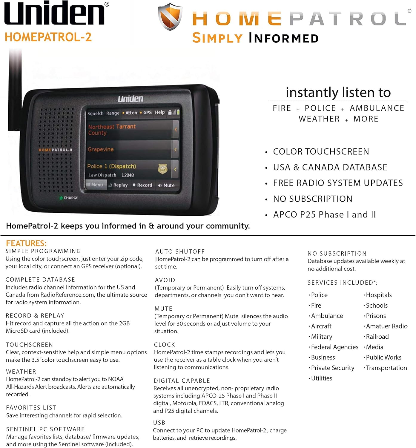 Amazon Com Uniden Homepatrol 2 Color Touchscreen Simple Program Digital Scanner Trunktracker V And S A M E Emergency Weather Alert Apco P25 Phase 1 And 2 Covers Usa And Canada Quick Record And Playback Electronics