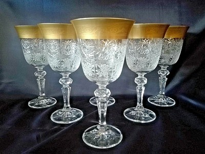 Set Of 4 Heavy Crystal Cut Wine Glasses With Gold Decorated Rim 7 1 2 T Ebay