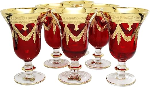 Amazon Com Interglass Italy Ruby Red Crystal Wine Goblets Vintage Design 24k Gold Hand Decorated 10 Oz Set Of 6 Wine Glasses