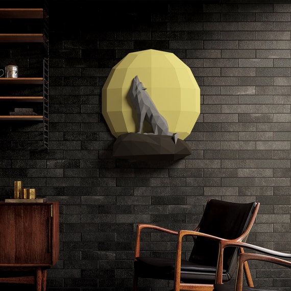Wolf On The Moon Papercraft 3d Diy Low Poly Paper Crafts Decor Etsy