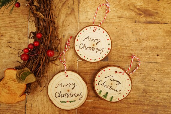 Set Of 3 Rustic Wooden Log Christmas Tree Decorations Merry Etsy